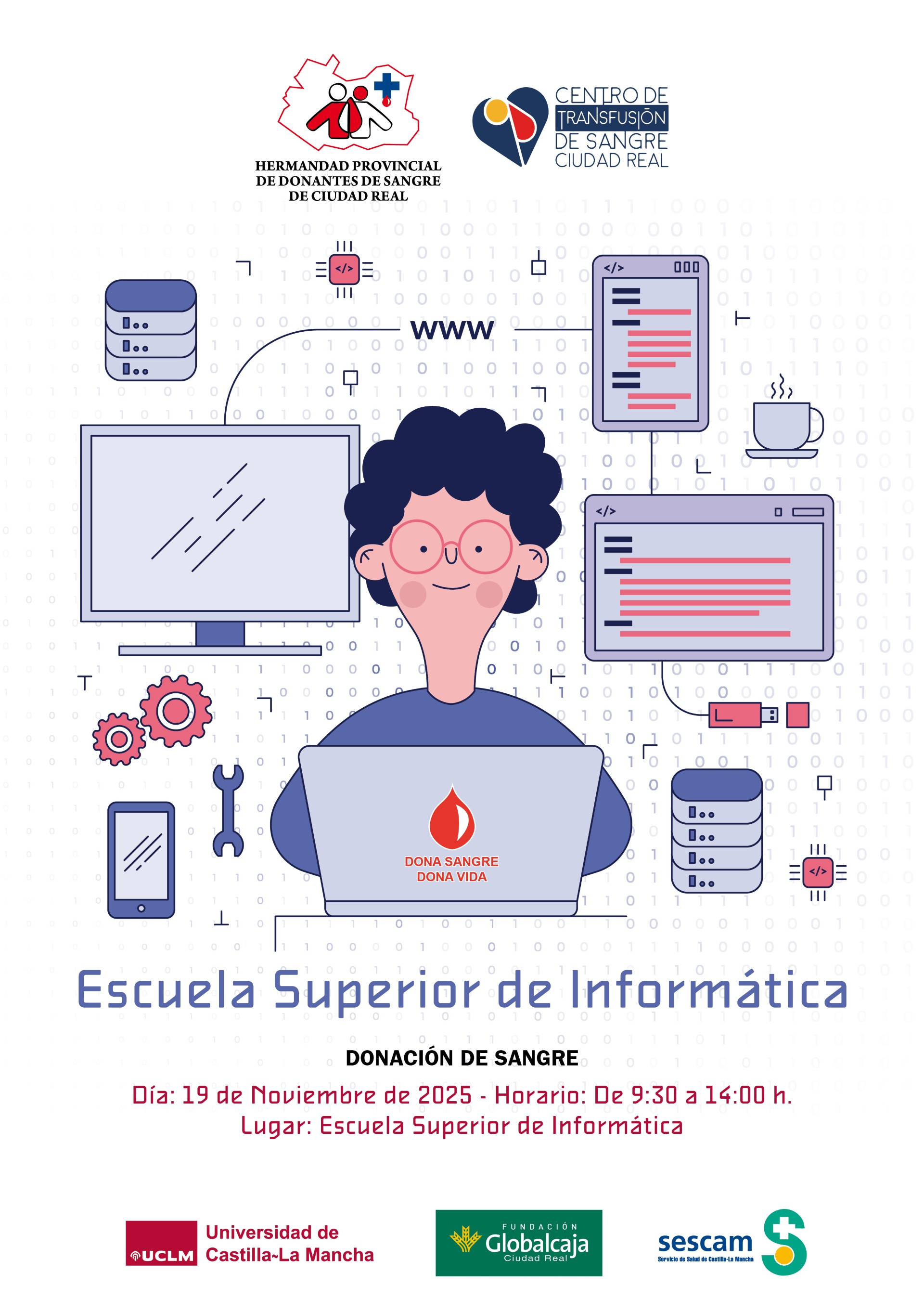 La Escuela Superior de Informática (UCLM) acogerá el próximo miércoles, 19 de noviembre de 2025, una jornada de donación de sangre organizada por la Hermandad Provincial de Donantes de Sangre de Ciudad Real y el Centro de Transfusión de Sangre de Ciudad Real, con la colaboración de Fundación Globalcaja y SESCAM. La colecta se realizará de 9:30 a 14:00 en el hall de la ESI. La comunidad universitaria y la ciudadanía están invitadas a participar en esta iniciativa solidaria bajo el lema “Dona sangre, dona vida”, que contribuye a mantener las reservas hospitalarias y a atender urgencias y tratamientos programados.