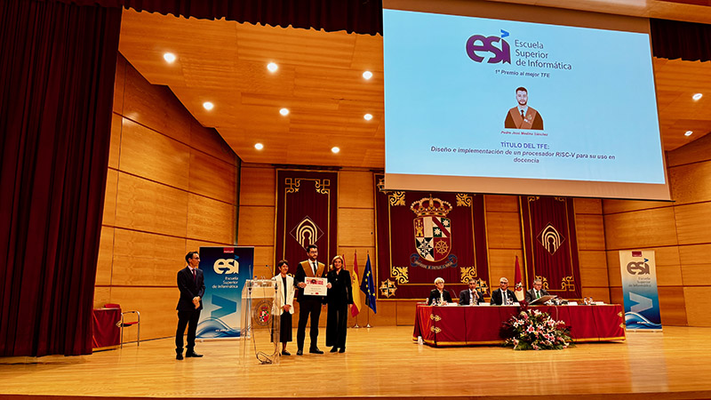 El Trabajo Fin de Grado (TFG) titulado «Diseño e implementación de un procesador RISC-V para su uso en docencia», realizado por Pedro José Medina Sánchez, fue reconocido durante la quinta edición de los Premios Máquina de Turing. El proyecto obtuvo el premio otorgado por la empresa Ubotica en la categoría de Sistemas Empotrados, así como el galardón al Mejor TFE concedido por la propia Escuela Superior de Informática.