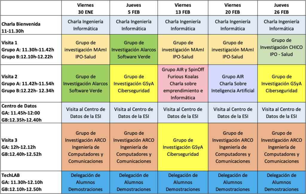 A partir del próximo viernes 30 de enero, darán comienzo las visitas de preuniversitarios y preuniversitarias procedentes de diferentes centros de estudios de la región, a la Escuela Superior de Informática (ESI) en la Universidad de Castilla-La Mancha (UCLM), con interés por cursar los estudios en Ingeniería Informática en el próximo curso 2026-2027. En concreto, las visitas se celebrarán los días 30 de enero, y 5, 13, 20 y 26 de febrero [Inscripción: cada centro recibirá un e-mail de invitación por parte de la Universidad de Castilla-La Mancha].