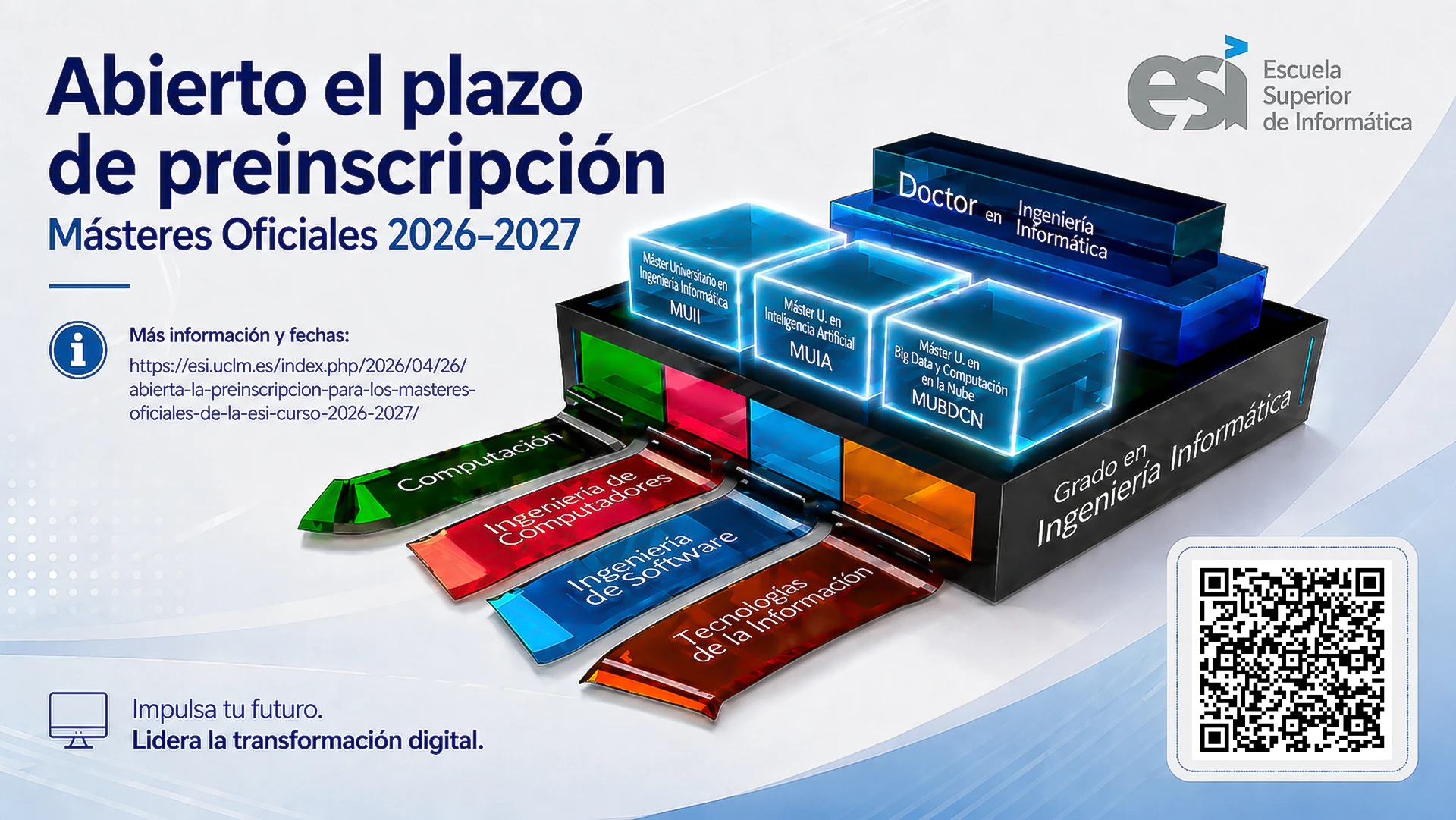 Ya está abierto el plazo de preinscripción para acceder a los Másteres oficiales que la Escuela Superior de Informática (ESI) de Ciudad Real oferta para el curso académico 2026-2027. Los interesados pueden formalizar su solicitud a través del portal oficial de preinscripción de la UCLM: